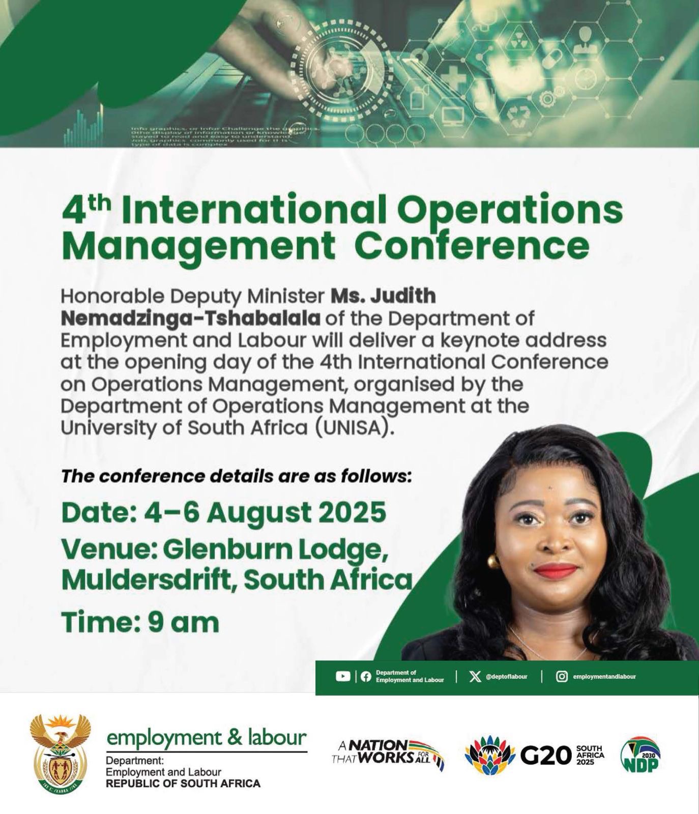 Honorable Deputy Minister MS. Judith Nemadzinga-Tshabalala of the Department of Employment and Labour will deliver a keynote address at the opening day of the 4th International Operations Management Conference, organized by the department of Operations Management at the University of South Africa (UNISA).